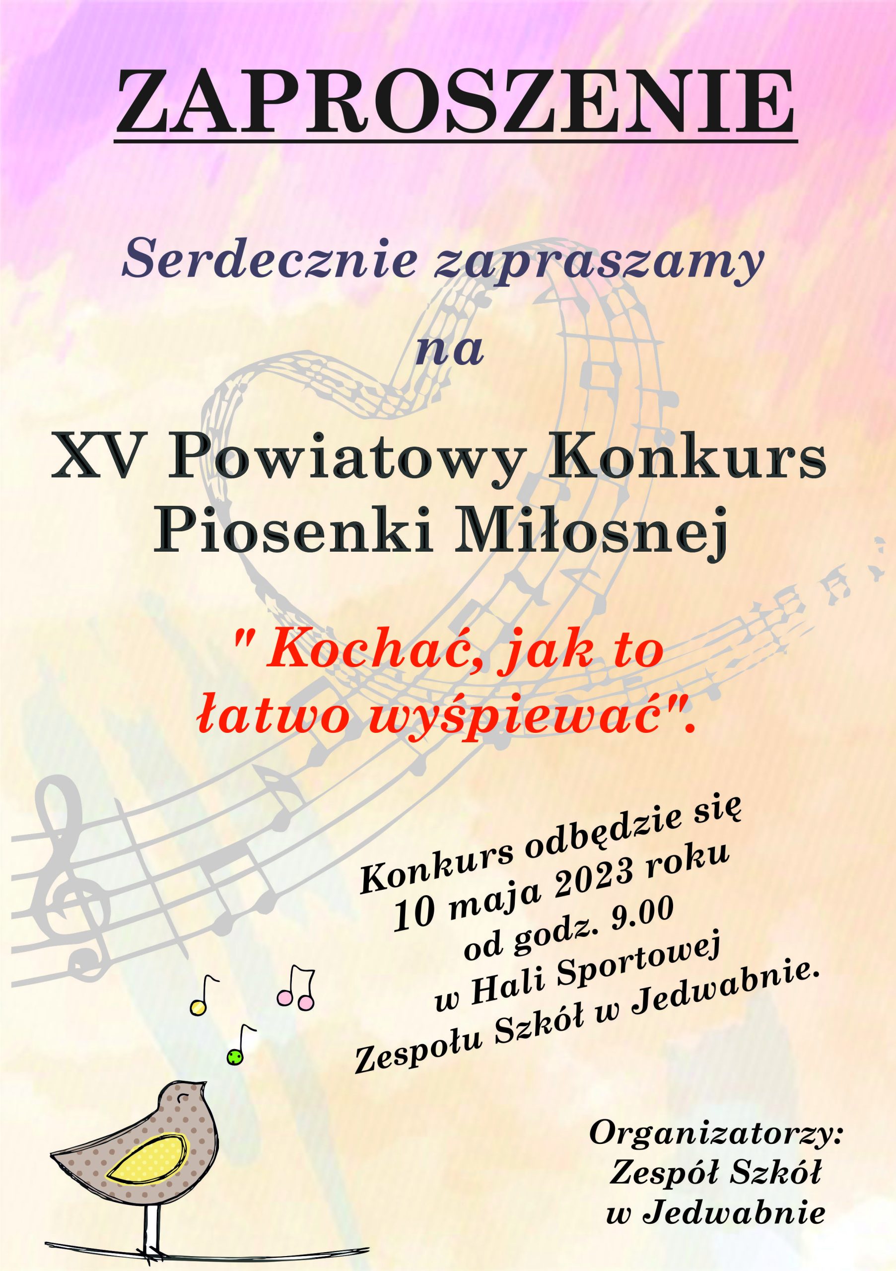 W imieniu Zespołu Szkół w Jedwabnie zapraszamy do udziału w XV Konkursie Piosenki Miłosnej „Kochać, jak to łatwo wyśpiewać”. Konkurs odbędzie się 10 maja 2023 r. w Hali Sportowej w Jedwabnie. W poniższym linku znajduje się regulamin oraz karta zgłoszeniowa na konkurs, którą należy wypełnić i wysłać do dnia 01.05.2023 r. do godz. 14:00 na adres: Zespół Szkół w Jedwabnie, ul. Polna 1 12-122 Jedwabno lub drogą elektroniczną na adres: [email protected]