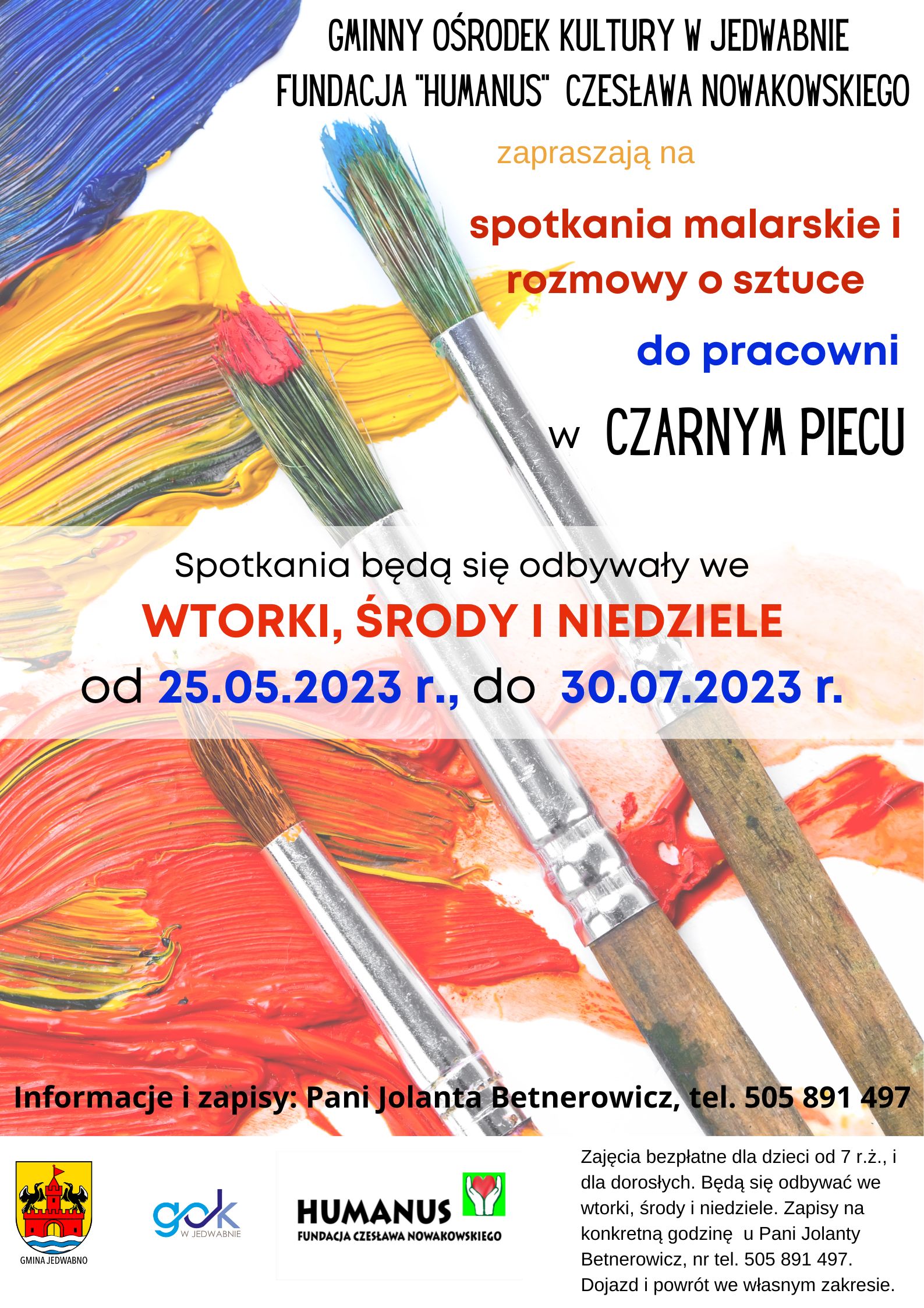 W ramach współpracy Gminnego Ośrodka Kultury w Jedwabnie i Fundacji „Humanus” Czesława Nowakowskiego serdecznie zapraszamy na spotkania malarskie i rozmowy o sztuce do pracowni w Czarnym Piecu. Spotkania będą się odbywały we wtorki, środy i niedziele w terminie od 25.05.2023 r. do 30.07.2023 r. , po umówieniu na konkretną godzinę u Pani Jolanty Betnerowicz (tel. 505 891 497). Zajęcia są bezpłatne, skierowane do dzieci od 7 r.ż., i dorosłych, zamieszkałych na terenie gminy Jedwabno. Dojazd i powrót we własnym zakresie.