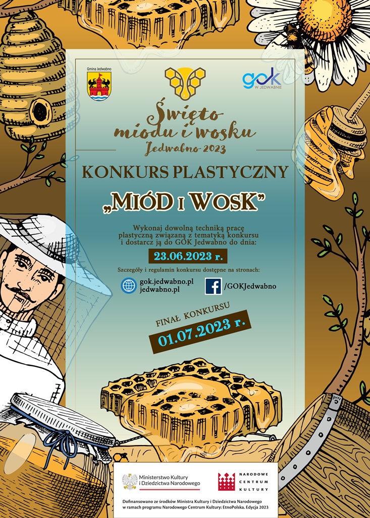 Zapraszamy do wzięcia udziału w konkursie plastycznym pn. „MIÓD i WOSK”, którego organizatorem jest Gminny Ośrodek Kultury w Jedwabnie. Aby wziąć udział w konkursie należy wykonać dowolną techniką pracę plastyczną nawiązującą tematyką do miodu i/lub wosku. W konkursie mogą wziąć udział dzieci i młodzież oraz dorośli mieszkańcy Powiatu Szczycieńskiego. Termin dostarczenia prac konkursowych upływa w dniu 23.06.2023 r., o godzinie 15:00