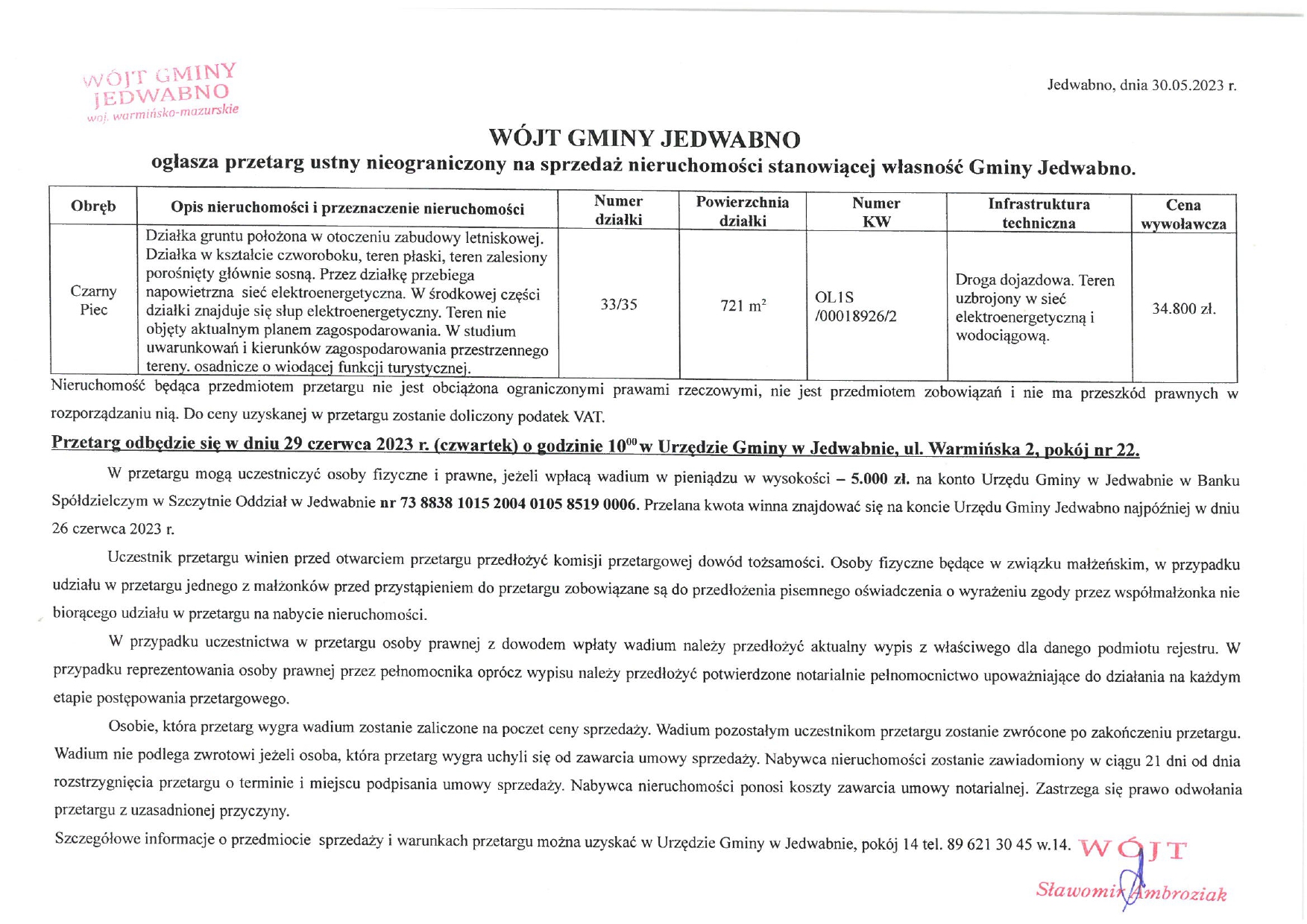 Przetarg ustny nieograniczony na sprzedaż nieruchomości stanowiącej własność Gminy Jedwabno.