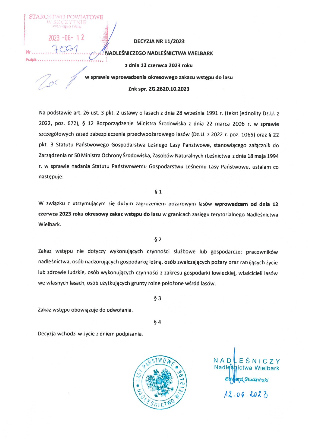 Okresowy zakaz wstępu do lasu z dnia 12.06.2023