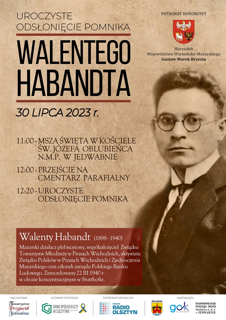 Serdecznie zapraszamy na uroczystości związane z odsłonięciem pomnika Walentego Habandta, które odbędą się dnia 30 lipca 2023 r. w Jedwabnie.