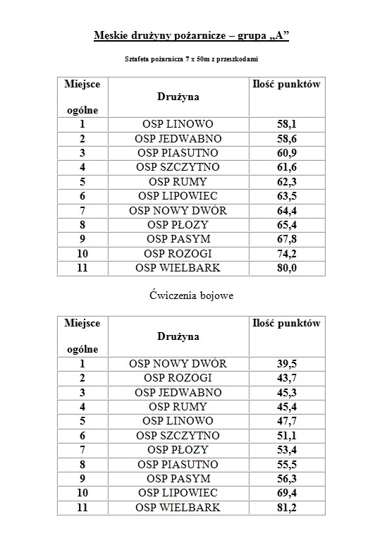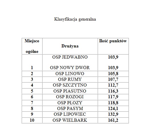 Po raz kolejny drużyny reprezentujące naszą gminę pokazały że ?rządzą? w powiecie. Drużyna OSP Nowy Dwór potwierdziła że od dwóch lat utrzymuje równy wysoki poziom, natomiast OSP Jedwabno po gruntownym odmłodzeniu drużyny ponownie zaczyna piąć się w górę. Po raz pierwszy w historii rozgrywanych zawodów na terenie powiatu szczycieńskiego dwie drużyny uzyskały w łącznej klasyfikacji identyczną liczbę punktów i zajęły równorzędne pierwsze miejsca. Mistrzami powiatu zostały drużyny OSP Nowy Dwór oraz OSP Jedwabno.