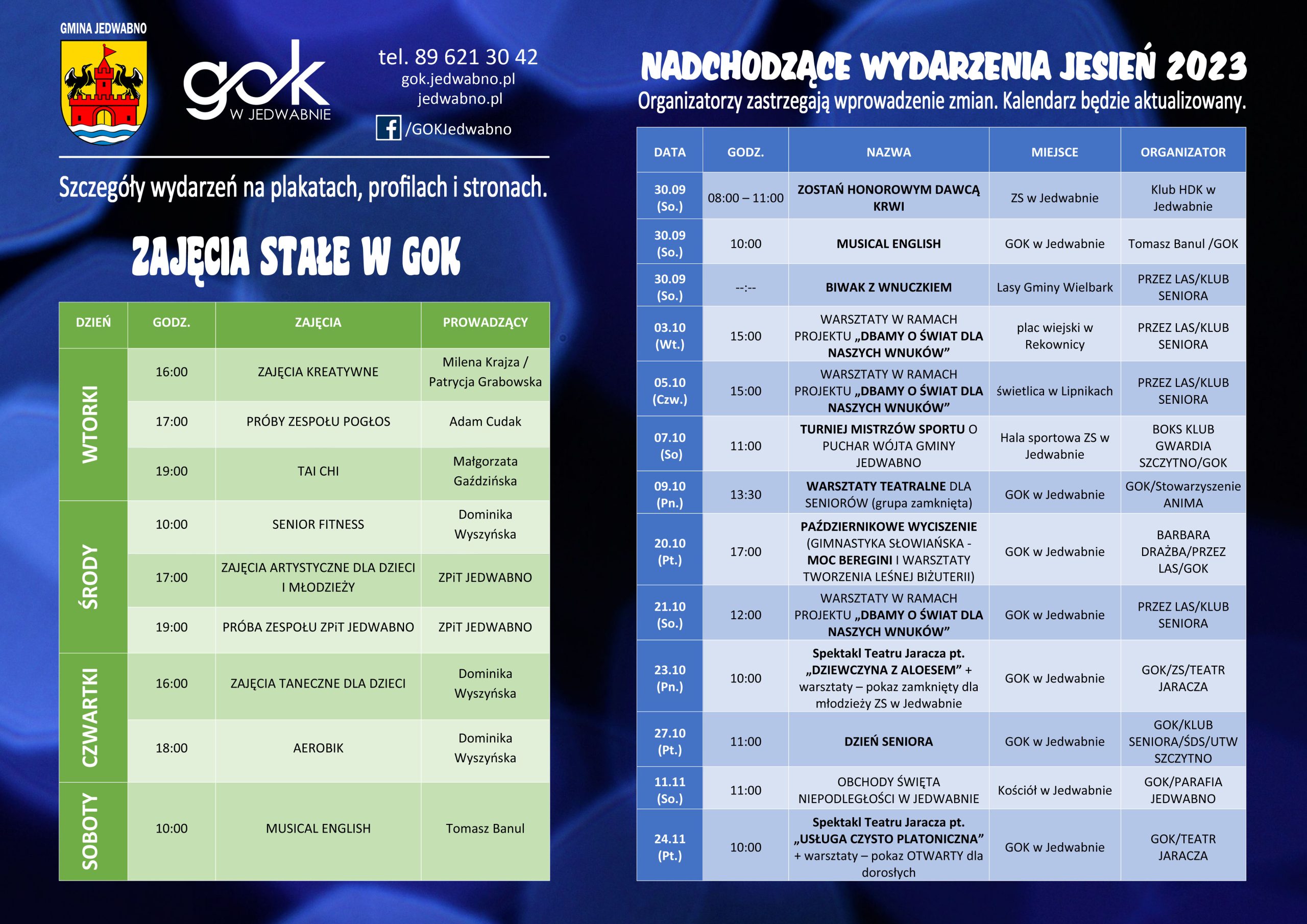 Przygotowaliśmy dla Was zestawienie zajęć w GOK i nadchodzących wydarzeń w Gminie Jedwabno. Harmonogram będzie na bieżąco aktualizowany gdyż życie zaskakuje Nas na każdym kroku. Liczymy na Wasz aktywny udział w zajęciach i wydarzeniach.