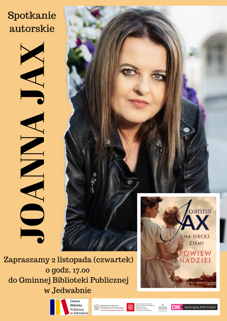 Zapraszamy na spotkanie autorskie z pisarką Joanną Jax, które odbędzie się 2 listopada (czwartek) o godz. 17.00 w Gminnej Bibliotece Publicznej w Jedwabnie.