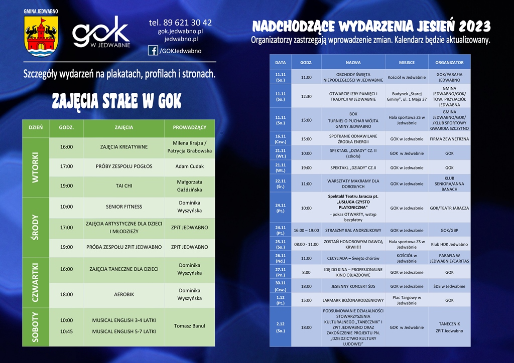 Masz mętlik w głowie??? My też. Dlatego, żeby ułatwić Wam i Nam nawigację po tym, co będzie się działo w Gminie Jedwabno, publikujemy kolejne zestawienie nadchodzących wydarzeń oraz ściągawkę z regularnymi zajęciami w GOK . Oczywiście, ww. spis będzie na bieżąco aktualizowany . Liczymy na Waszą obecność ‍♂️‍♀️ i aktywny udział w zajęciach i wydarzeniach .