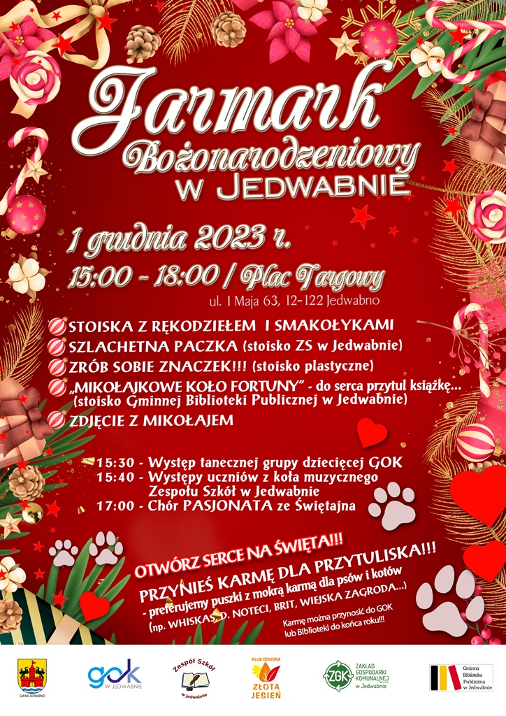 Już 1 grudnia 2023 r. , w godzinach 15:00 – 18:00 na Palcu Targowym w Jedwabnie odbędzie Jarmark Bożonarodzeniowy. Na ten wyjątkowy dzień przygotowaliśmy mnóstwo świątecznych atrakcji i zaprosiliśmy lokalnych rzemieślników, rękodzielników i artystów – wszystko dla Was!