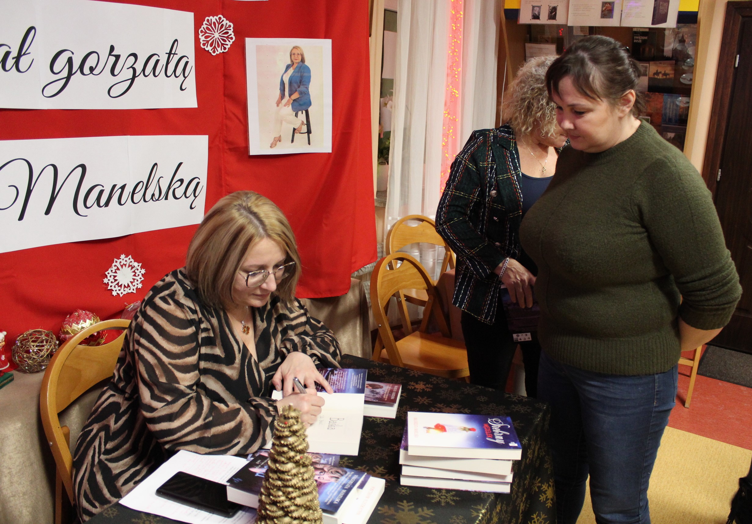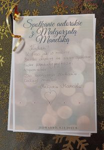 Piątkowy wieczór był dla czytelników Gminnej Biblioteki Publicznej w Jedwabnie niezwykłym świętem literatury, pełnym inspiracji i magicznej atmosfery. Spotkanie z utalentowaną pisarką panią Małgorzatą Manelską, było nie tylko mikołajkowym prezentem dla naszej społeczności czytelniczej, ale także niezapomnianym doświadczeniem literackim.
