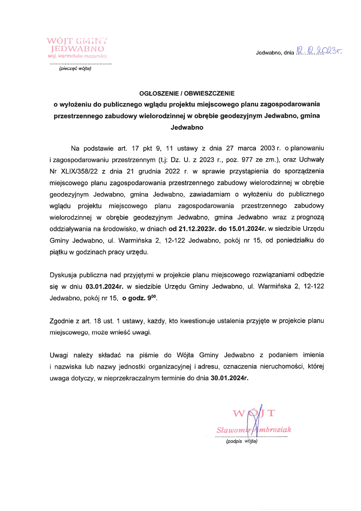 Obwieszczenie o wyłożeniu do publicznego wglądu projektu miejscowego planu zagospodarowania przestrzennego zabudowy wielorodzinnej w obrębie geodezyjnym Jedwabno, gmina Jedwabno
