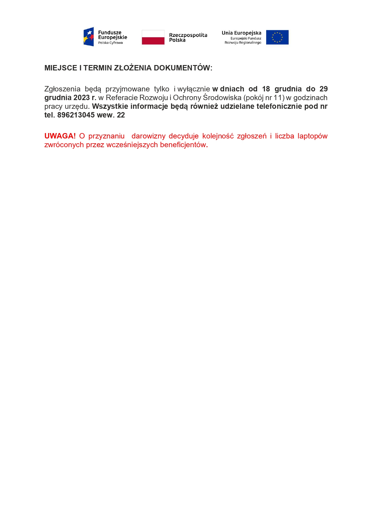 W związku z wejściem w życie programu „Laptop dla klasy IV” i możliwością zwrotu laptopów otrzymanych w ramach Grantów PPGR ogłasza się dodatkowy nabór Beneficjentów w Konkursie Grantowym Cyfrowa Gmina – „Granty PPGR – Wsparcie dzieci i wnuków byłych pracowników PGR w rozwoju cyfrowym”, realizowanym w ramach Programu Operacyjnego Polska Cyfrowana lata 2014-2020.