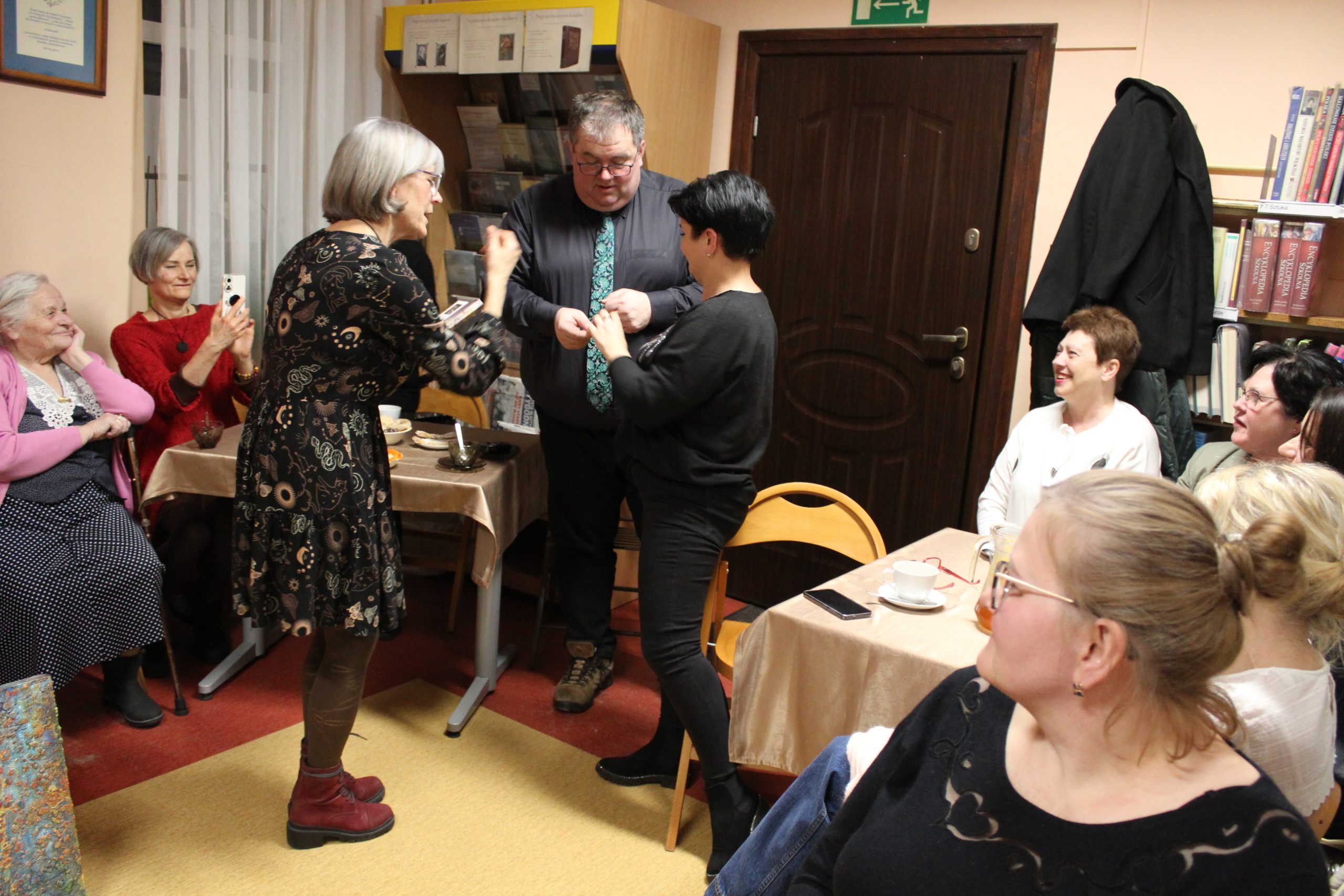 Biblioteczną przestrzeń wypełnili miłośnicy literatury, których entuzjazm stworzył niesamowitą atmosferę, sprawiając, że ten wieczór był wyjątkowy. Pani Grażyna podsumowała go w ten sposób: „…ludzie w Jedwabnie są wyjątkowi. Widziałam jak ze sobą rozmawiali, śmiali się w grupkach, witali, całowali. Taka fajna rodzinna społeczność. Oglądam zdjęcia to jest taki cudny klimat. Przemieszczamy się, śmiejemy, to z tym, to z tamtym…”