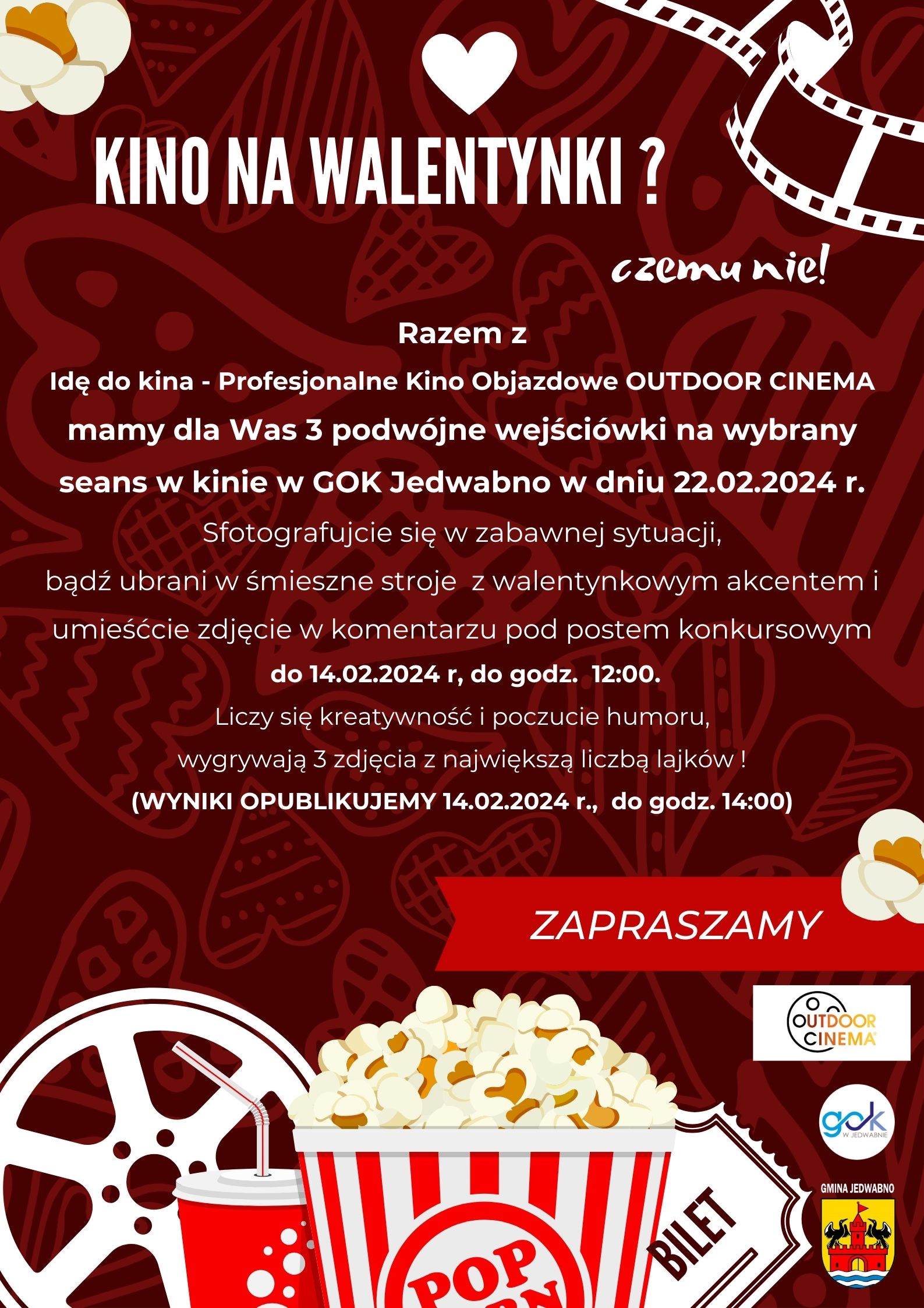 Gminny Ośrodek Kultury w Jedwabnie i Idę do kina w Jedwabnie zapraszają do udziału w zabawie walentynkowej![]()