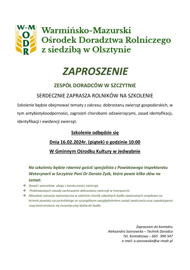 Warmińsko – Mazurski Ośrodek Doradztwa Rolniczego z siedzibą w Olsztynie serdecznie zaprasza na szkolenie dla rolników, które odbędzie się 16.02.2024 r. (piątek) o godz. 10:00 , w Gminnym Ośrodku Kultury w Jedwabnie. Szczegóły na plakacie.