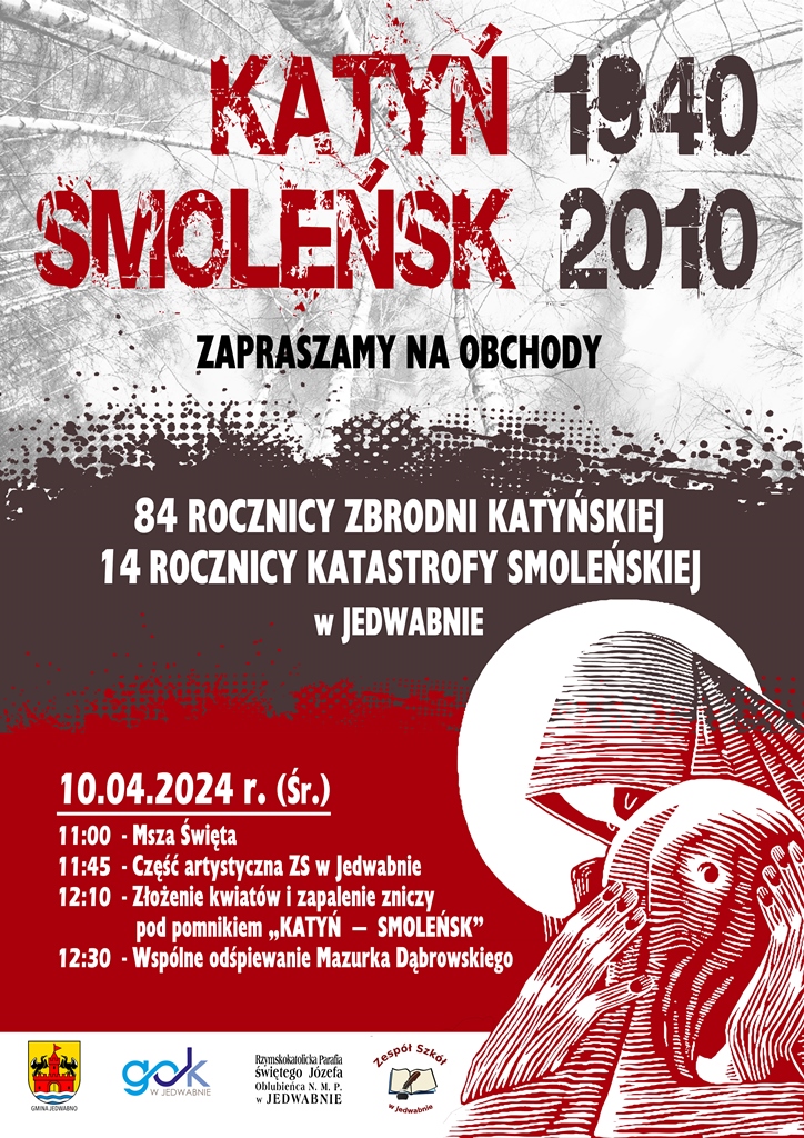 Zapraszamy na obchody 84 Rocznicy Zbrodni Katyńskiej i 14 Rocznicy Katastrofy Smoleńskiej w Jedwabnie, która odbędzie się 10.04.2024 r. Szczegółowe informacje na poniższym plakacie.