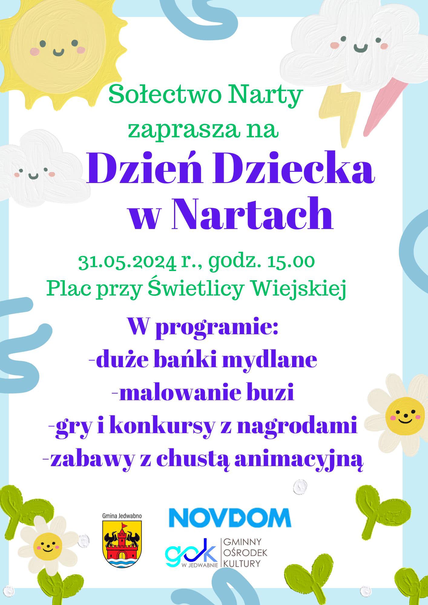 Zapraszamy na Dzień Dziecka w Nartach. Więcej informacji na plakacie.