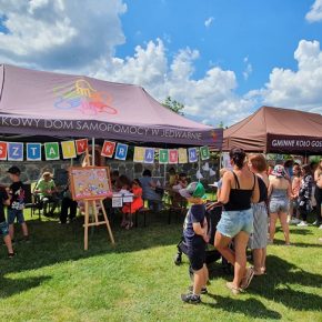 - Widok namiotów GKW w Jedwabnie i ŚDS oraz uczestników pikniku.