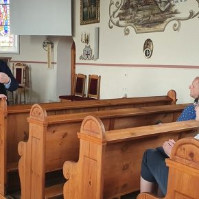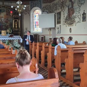 - Środek Kościoła. Widok Wójta Gminy Jedwabno opowiadjścego o historii Kościoła w Jedwabnie..