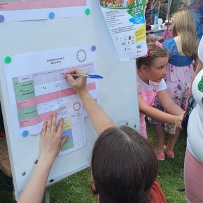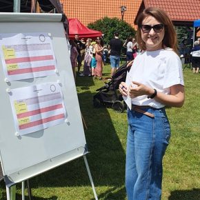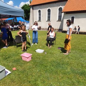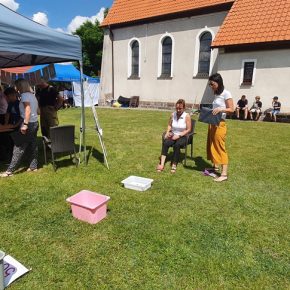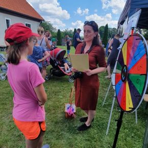 - Animatorka GBP w Jedwabnie i uczestnik Koła Fortuny podczas pikniku.