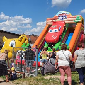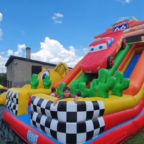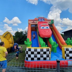 - Widok dmuchanych zjeżdżalni i bawiących sie na nich dzieci.