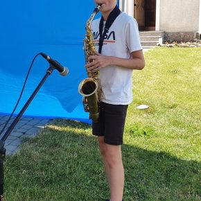 - Widok sceny. Występ solowy na saksofonie ucznia ZS w Jedwabnie.