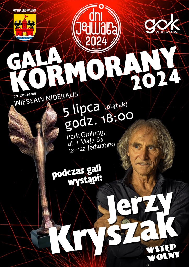 05.07.2024 r. o godzinie 18:00 serdecznie zapraszamy na Galę Kormorany, która odbędzie się w ramach XXX Dni Jedwabna. Po uroczystej Gali zapraszamy na występ kabaretowy JERZEGO KRYSZAKA.