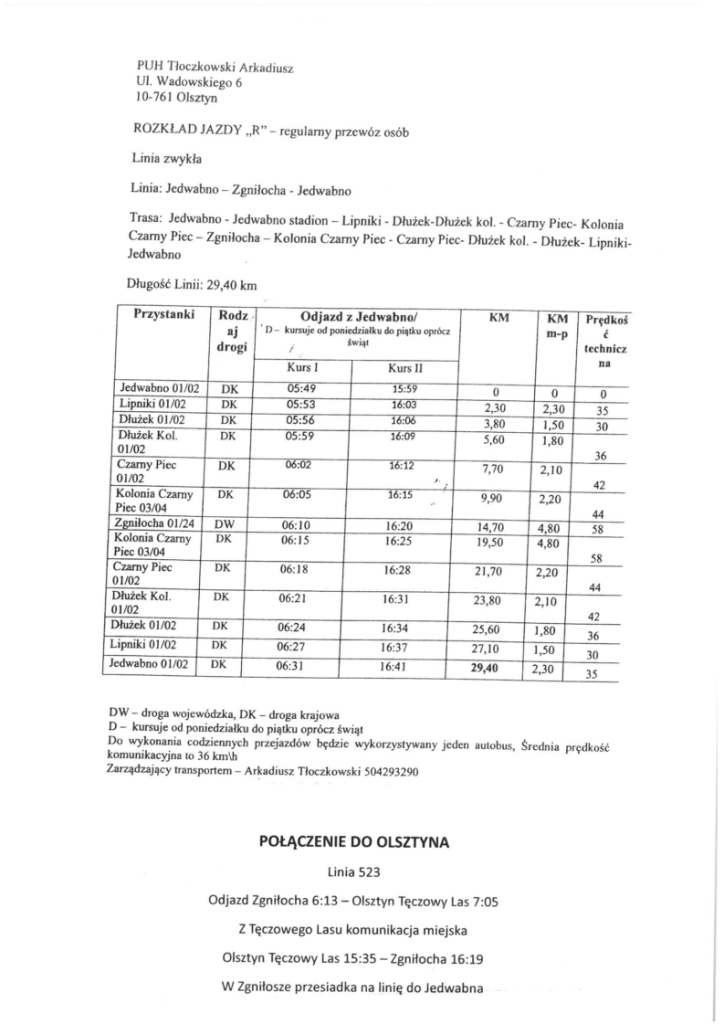 Informuję, że od dnia 03.07.2024 r. obowiązuje nowy rozkład jady na linię Jedwabno – Zgniłocha docelowo dojazd do Olsztyna Tęczowy Las z przesiadką w Zgniłosze.