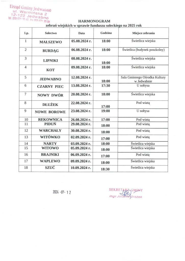 Harmonogram zebrań wiejskich w sprawie funduszu sołeckiego na 2025 rok.