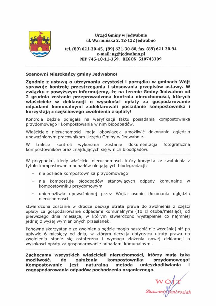 3. Szanowni Mieszkańcy gminy Jedwabno! Zgodnie z ustawą o utrzymaniu czystości i porządku w gminach Wójt sprawuje kontrolę przestrzegania i stosowania przepisów ustawy. W związku z powyższym informujemy, że na terenie Gminy Jedwabno od 2 grudnia zostanie przeprowadzona kontrola nieruchomości, których właściciele w deklaracji o wysokości opłaty za gospodarowanie odpadami komunalnymi zadeklarowali posiadanie kompostownika i korzystają z częściowego zwolnienia z opłaty!