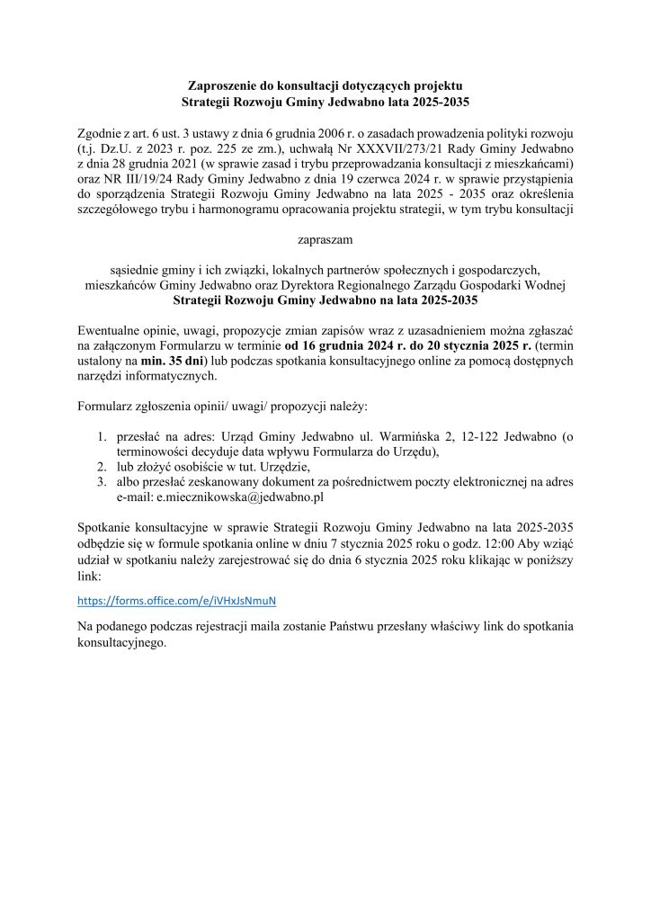 Formularz do składania wniosków oraz projekt strategii znajduje się pod linkiem https://bip.jedwabno.pl/6315/ogloszenie-o-rozpoczeciu-konsultacji-spolecznych-w-sprawie-strategii-rozwoju-gminy-jedwabno.html