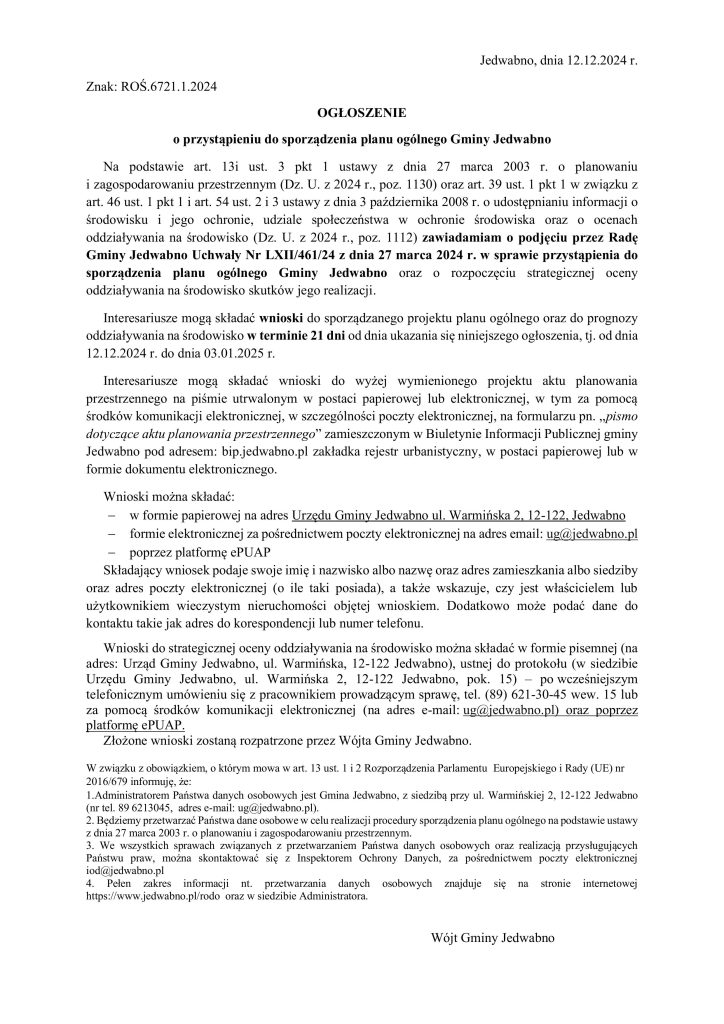 Wójt Gminy Jedwabno informuje o ponownej możliwości składania wniosków do Planu Ogólnego do 03.01.2025r. Wszystkie wnioski złożone do tej pory zostaną rozpatrzone, nie ma konieczności ponownego składania wniosków. Formularz oraz instrukcja wypełnienia znajdują się pod linkiem https://bip.jedwabno.pl/6290/etap-i-przystapienie-do-sporzadzenia-planu-ogolnego-formularz-do-skladania-wnioskow.html