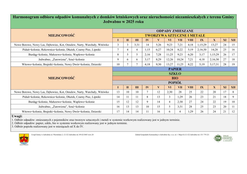 3. Harmonogram odbioru odpadów komunalnych z domków letniskowych oraz nieruchomości niezamieszkałych z terenu Gminy Jedwabno w 2025 roku