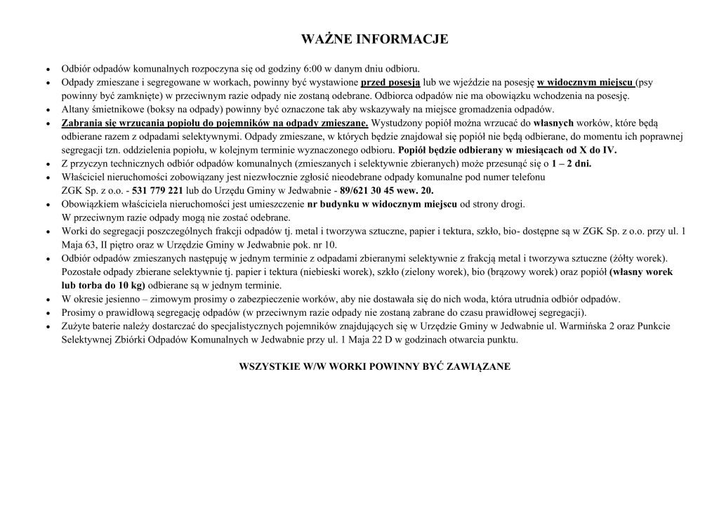 Harmonogram odbioru odpadów komunalnych z domków letniskowych oraz nieruchomości niezamieszkałych z terenu Gminy Jedwabno w 2025 roku