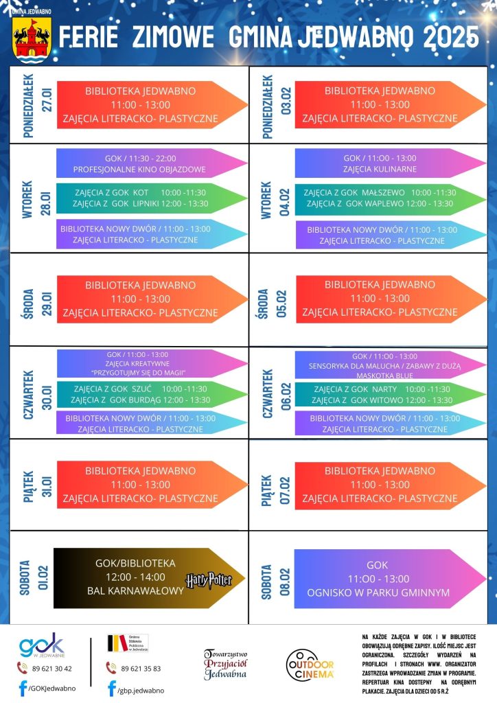 Zapraszamy dzieci i młodzież na zajęcia z okazji FERII ZIMOWYCH 2025 w Jedwabnie. Na zajęcia w GOK oraz w Bibliotece obowiązują odrębne zapisy telefoniczne! Ilość miejsc ograniczona! Szczegóły na plakacie.
