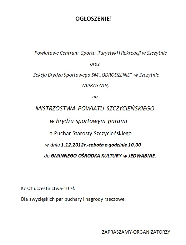 Mistrzostwa Powiatu Szczycieńskiego w brydżu sportowym parami, GOK 01.12.2012 rok