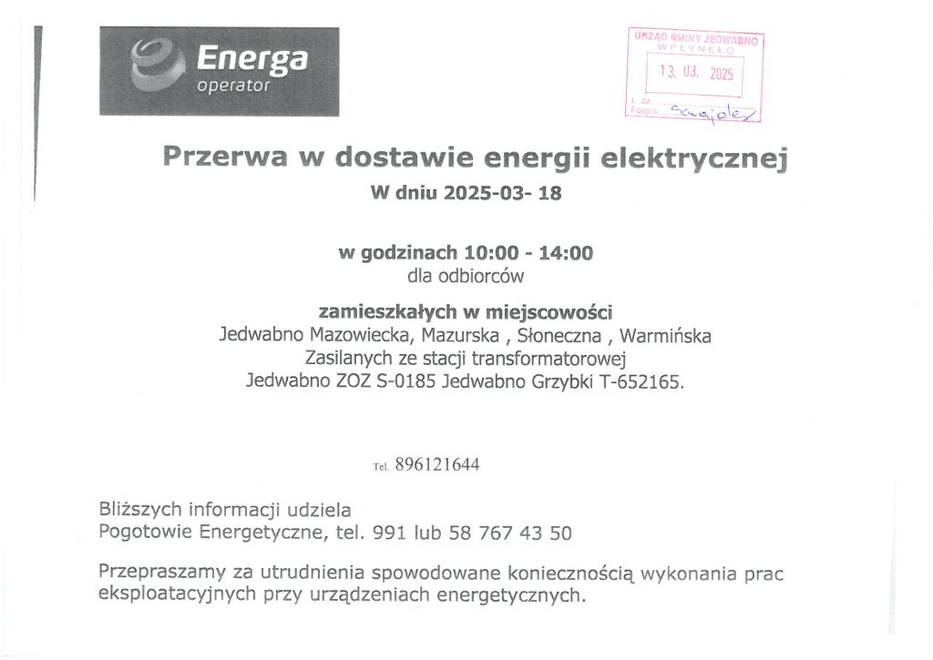 3. Informacja dot. przerwy w dostawie energii elektrycznej w dniu 18.03.2025 r. (wtorek).