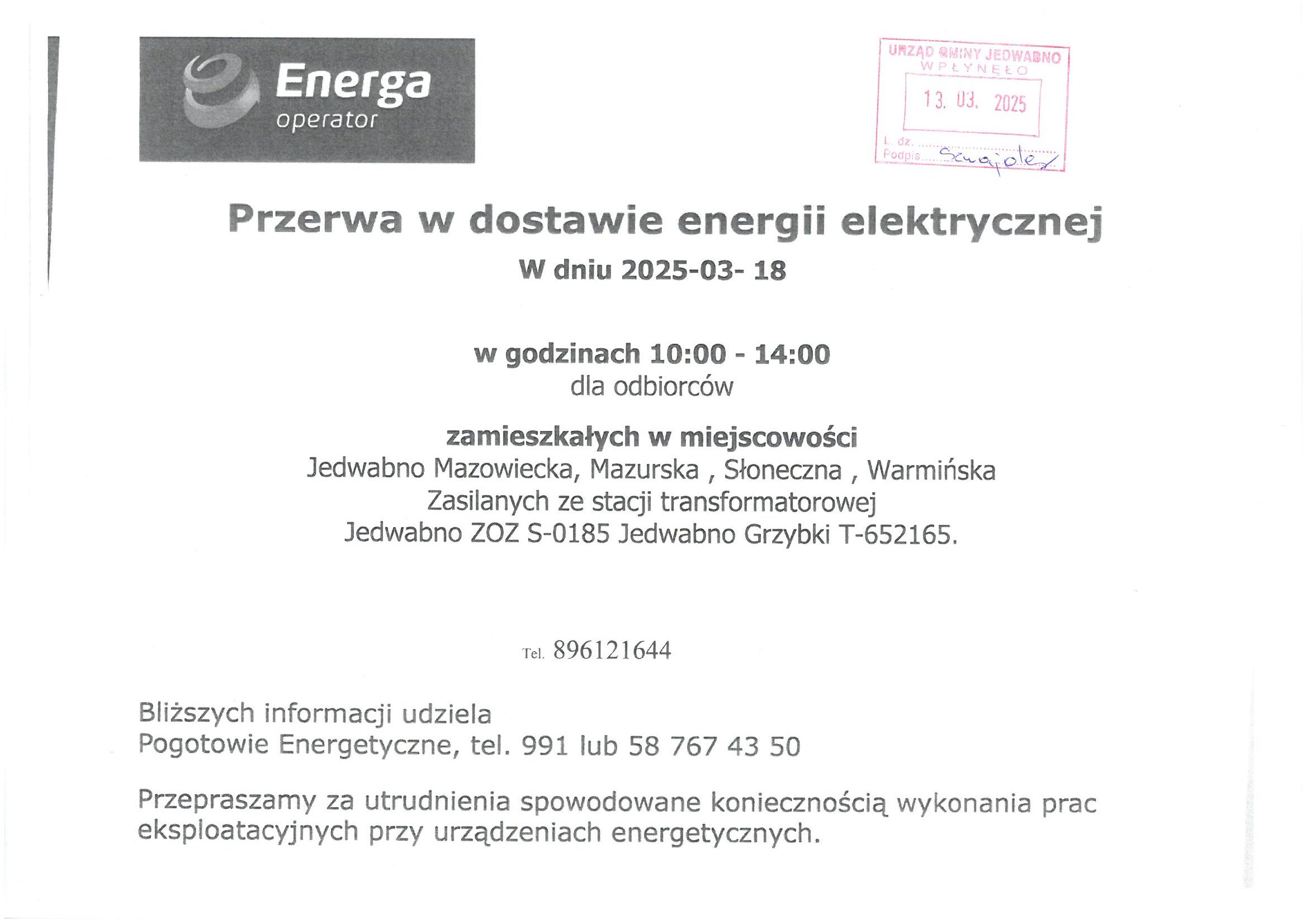 Informacja dot. przerwy w dostawie energii elektrycznej w dniu 18.03.2025 r. (wtorek).