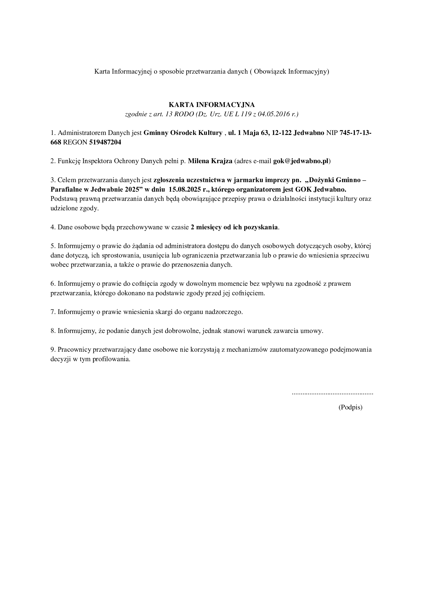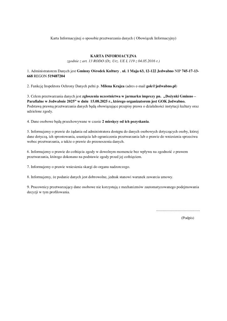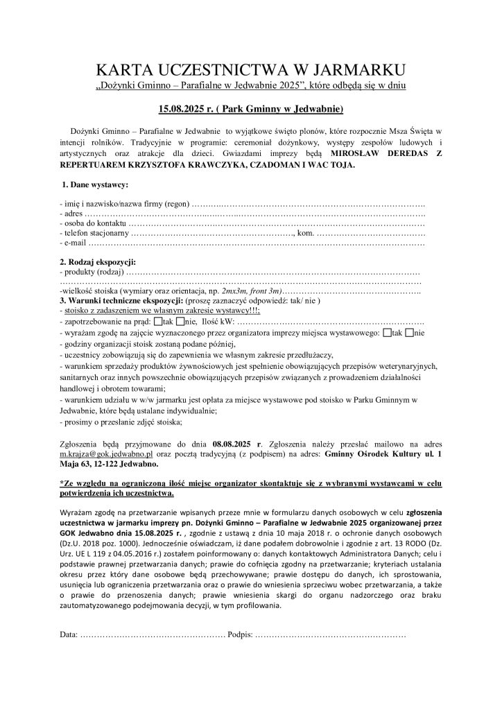 Karty zgłoszeniowe (do pobrania niżej) prosimy przesłać do 08.08.2025 r. na adres e- mail: [email protected] lub pocztą tradycyjną na adres: Gminny Ośrodek Kultury ul. 1 Maja 63, 12-122 Jedwabno. Więcej informacji pod nr tel. 89 621 30 42.