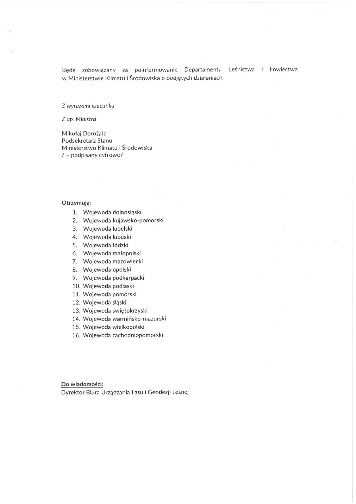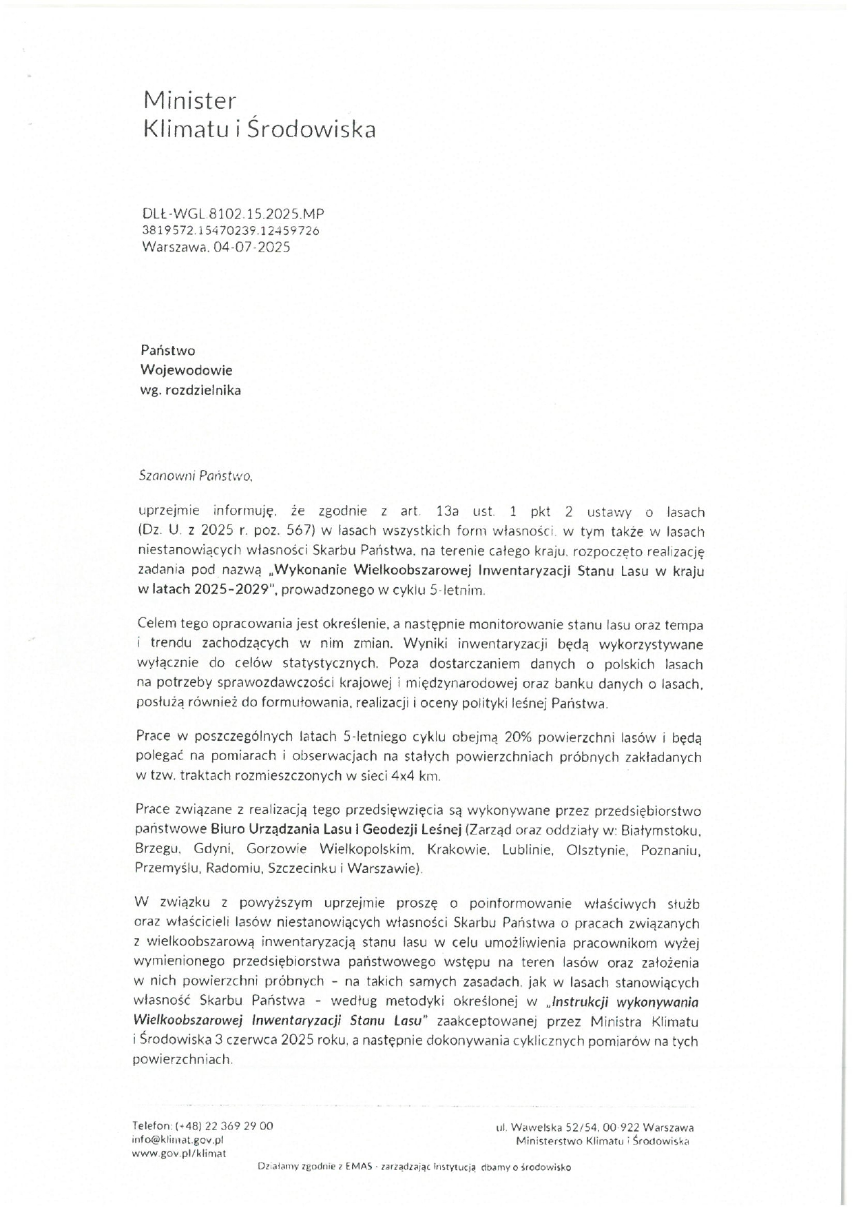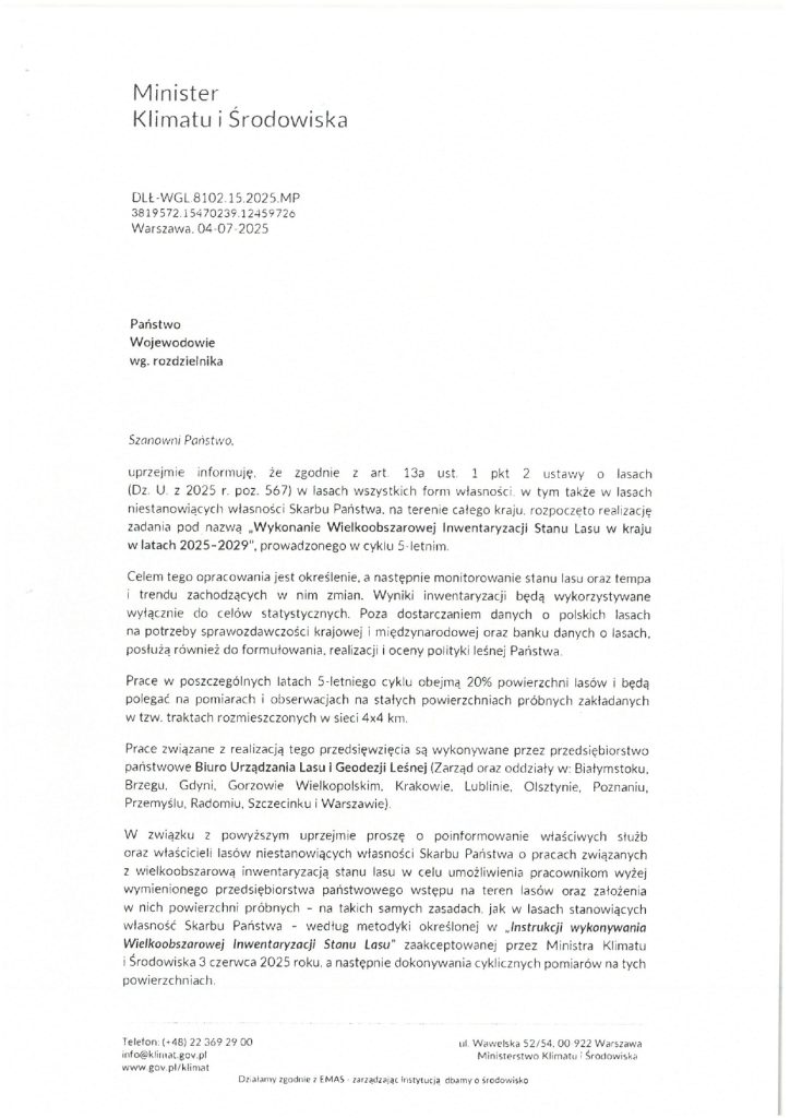W związku z powyższym prosimy właścicieli lasów niestanowiących własności Skarbu Państwa o umożliwienie pracownikom wymienionego wyżej przedsiębiorstwa wstępu na teren lasów oraz założenia w nich powierzchni próbnych – na takich samych zasadach, jak w lasach stanowiących własność Skarbu Państwa – według metodyki określonej w „Instrukcji wykonywania Wielkoobszarowej Inwentaryzacji Stanu Lasu” zaakceptowanej przez Ministra Klimatu i Środowiska 3 czerwca 2025 roku, a następnie dokonywania cyklicznych pomiarów na tych powierzchniach.