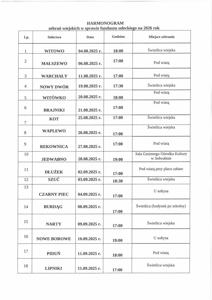 3. Harmonogram zebrań wiejskich w sprawie funduszu sołeckiego na 2026 rok.