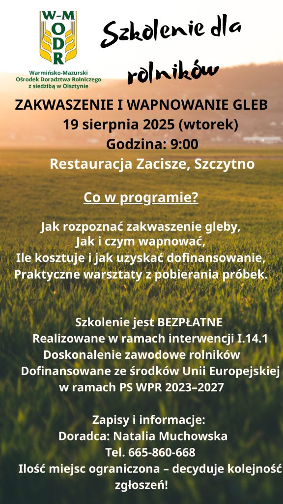 W imieniu Warmińsko – Mazurskiego Ośrodka Doradztwa Rolniczego z siedzibą w Olsztynie zapraszamy na szkolenie dla rolników, które odbędzie się 19 sierpnia 2025 r., o godz. 9:00 w Restauracji Zacisze w Szczytnie. Szczegóły na poniższym plakacie.