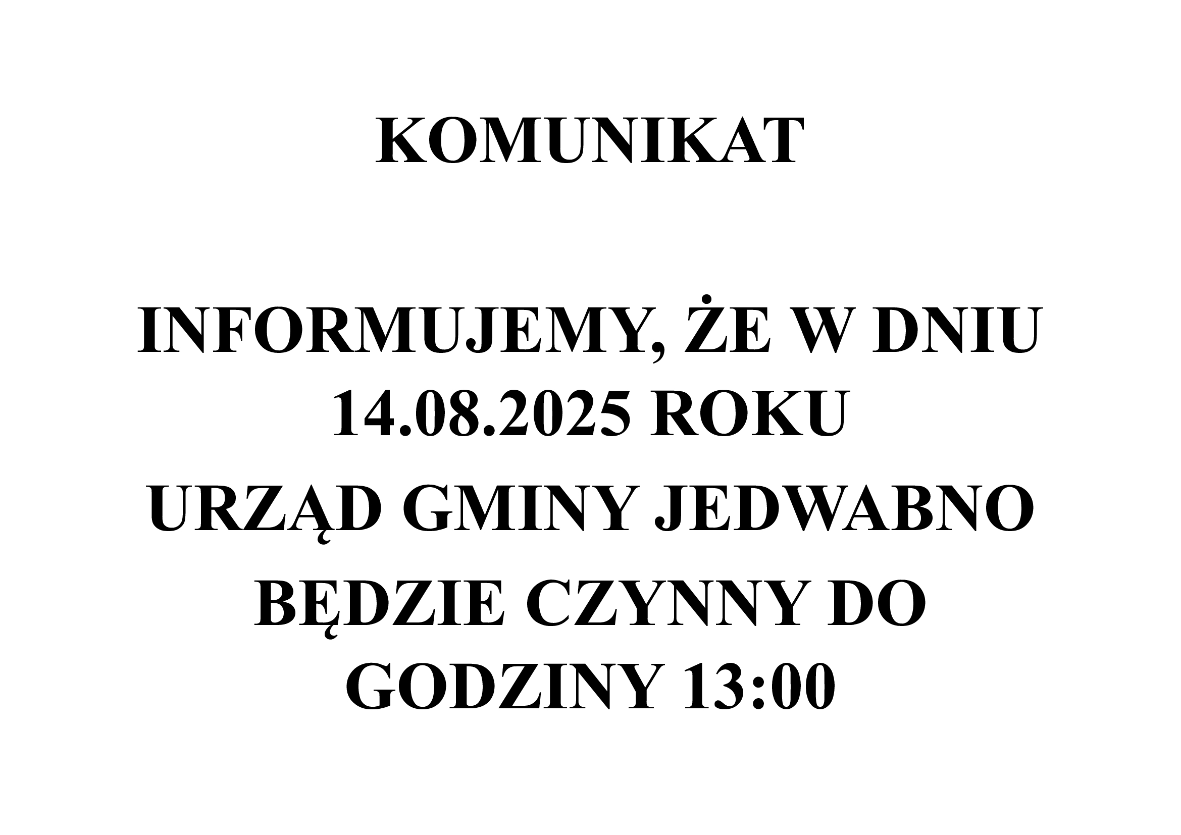 Informacja dot. pracy Urzędu Gminy w Jedwabnie w dniu 14.08.2025 r.