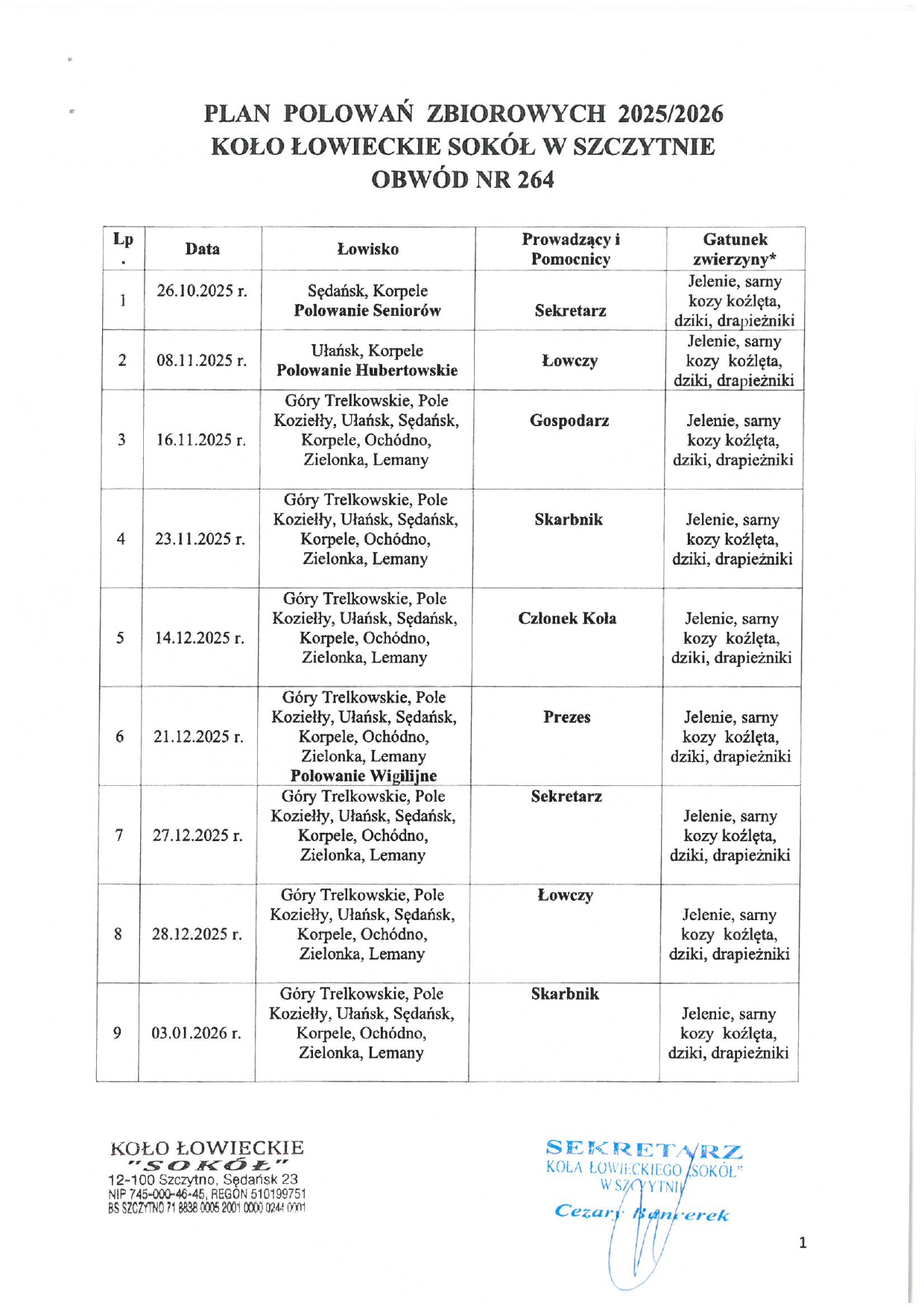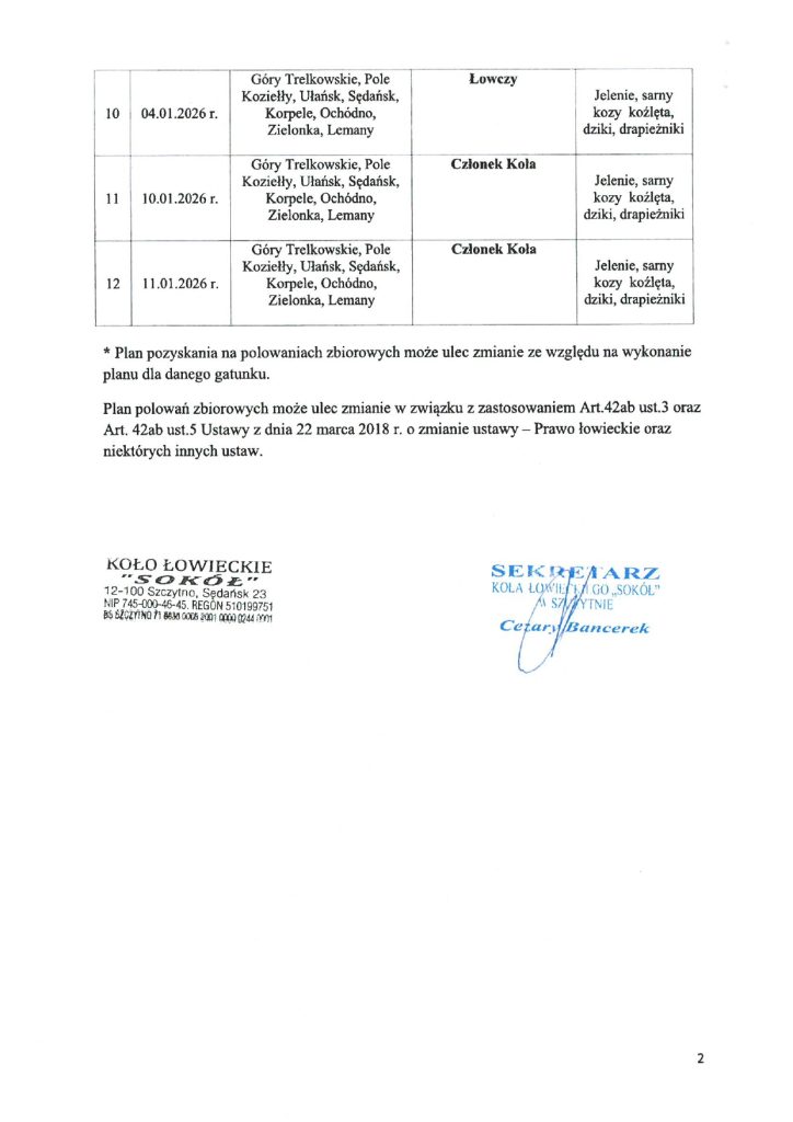 3. Plan Polowań Zbiorowych 2025/2026 Koła Łowieckiego Sokół w Szczytnie obwód nr 264