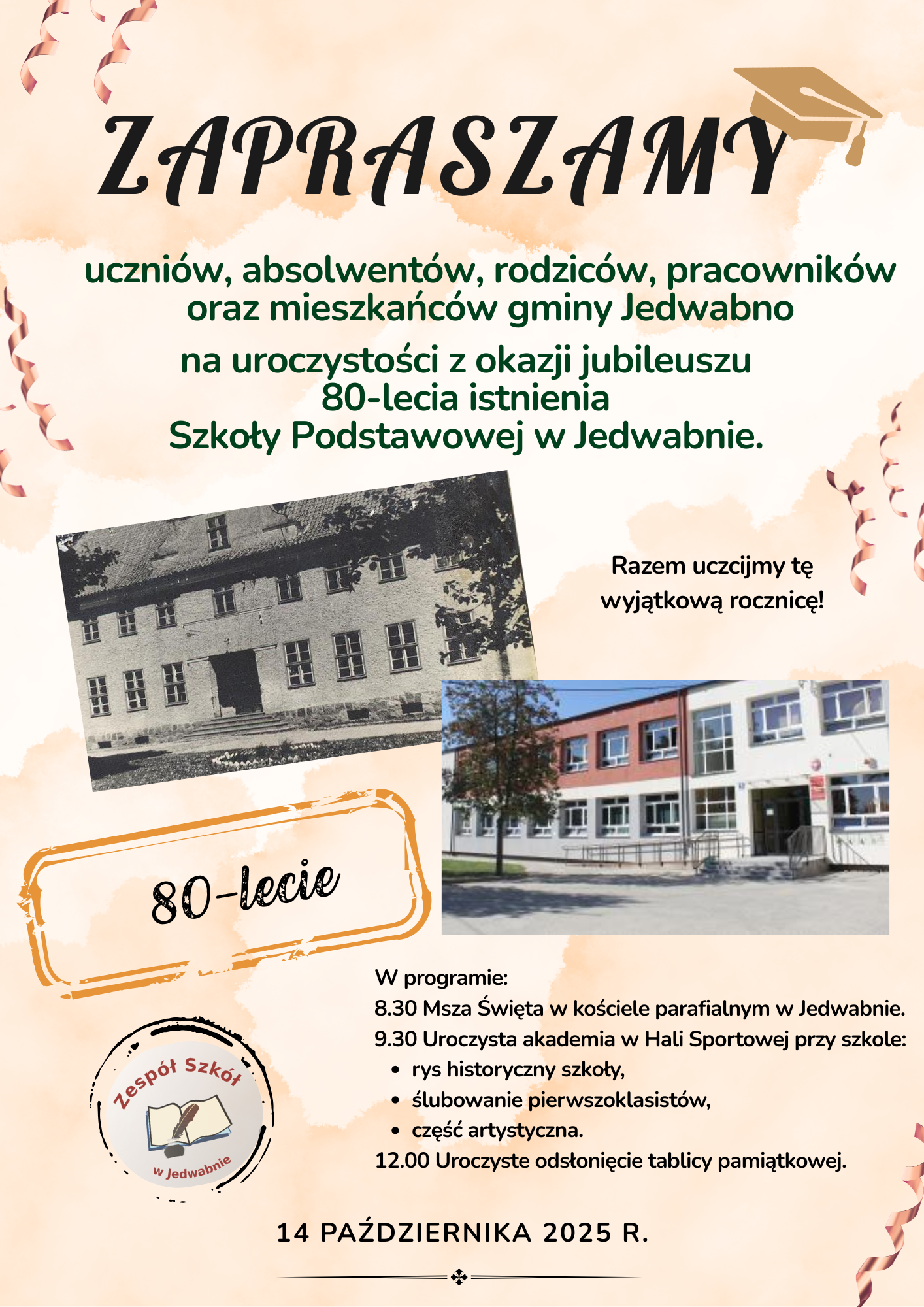 W imieniu Organizatorów zapraszamy na 80 – lecie istnienia Szkoły Podstawowej w Jedwabnie. Więcej informacji na plakacie!