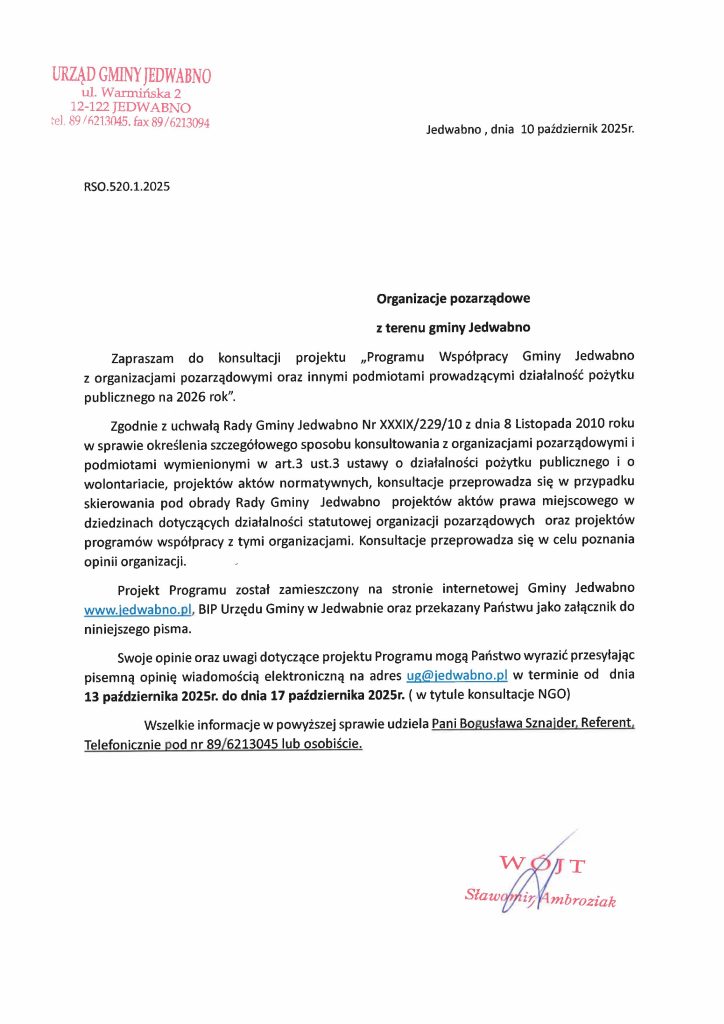 3. Konsultacje projektu „Programu współpracy Gminy Jedwabno z organizacjami pozarządowymi oraz innymi podmiotami prowadzącymi działalność pożytku publicznego na 2026 rok”