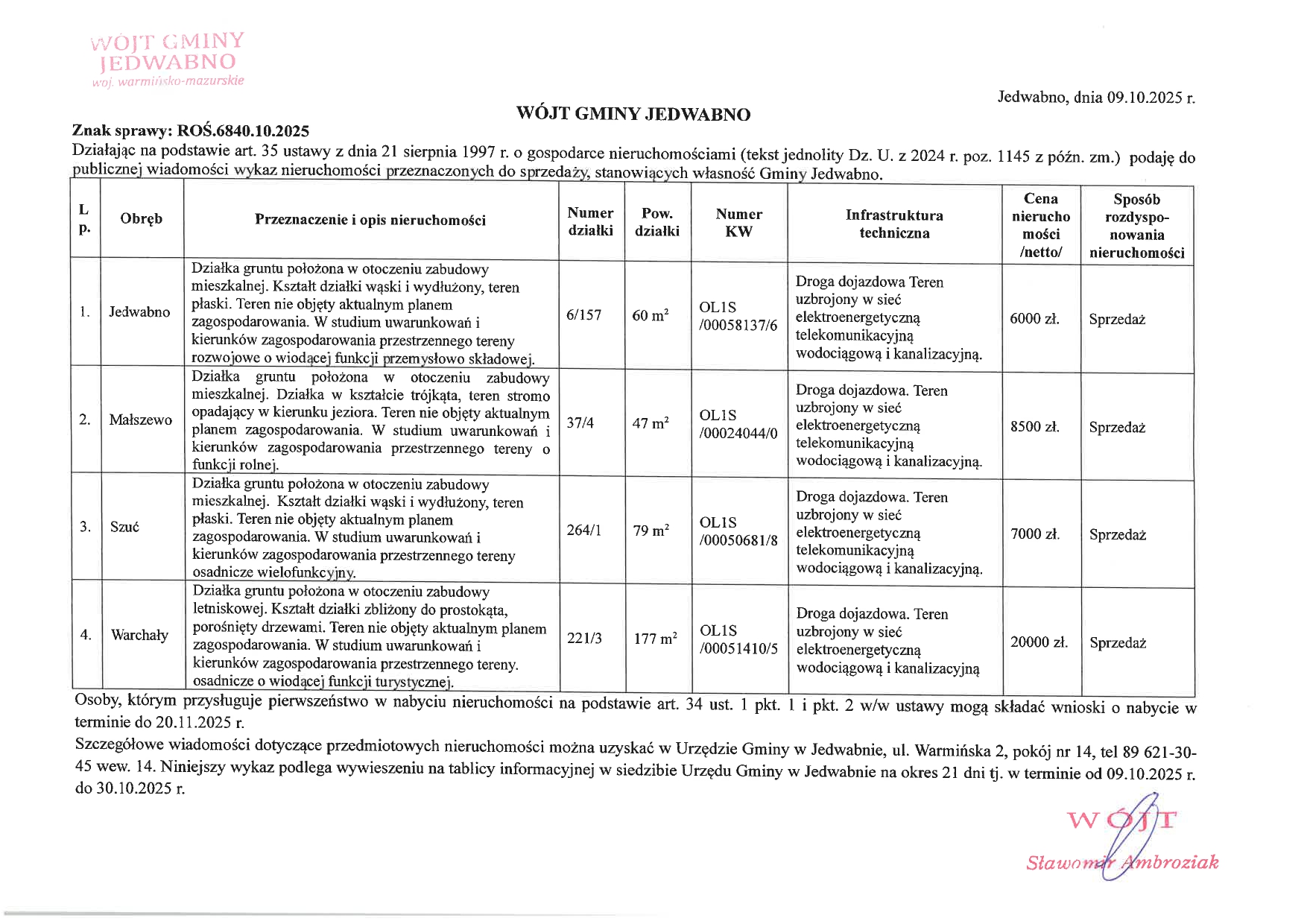 3. Wykaz nieruchomości przeznaczonych do sprzedaży stanowiących własność Gminy Jedwabno ROŚ.6840.10.2025