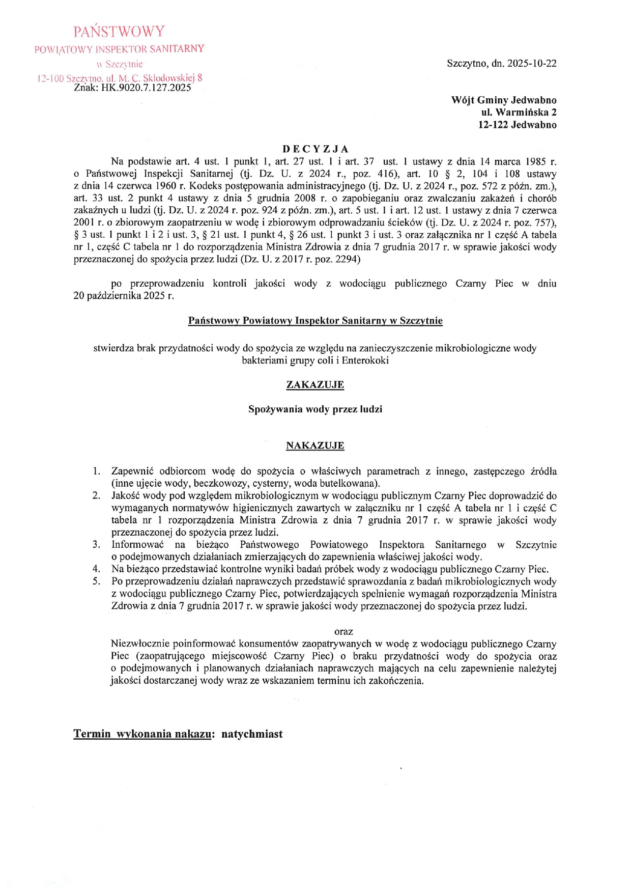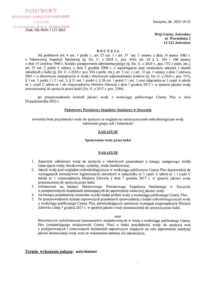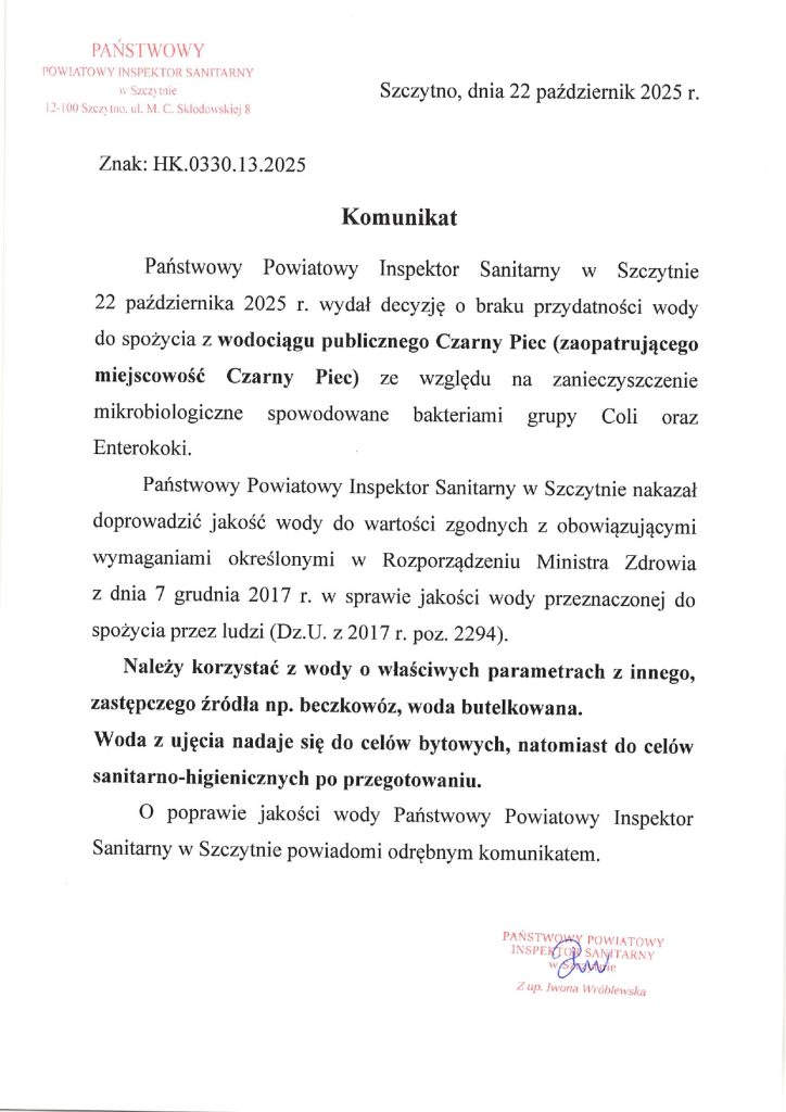 KOMUNIKAT o braku przydatności wody do spożycia w miejscowości Czarny Piec.