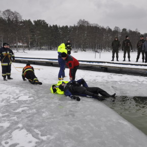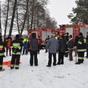 Zanim druhowie przystąpili do pozorowanej akcji wysłuchali krótkiego wykładu na temat bezpieczeństwa poruszania się na lodzie, a także technik wydobywania poszkodowanych z przerębli.