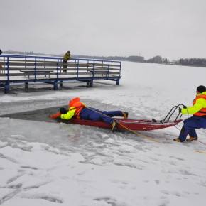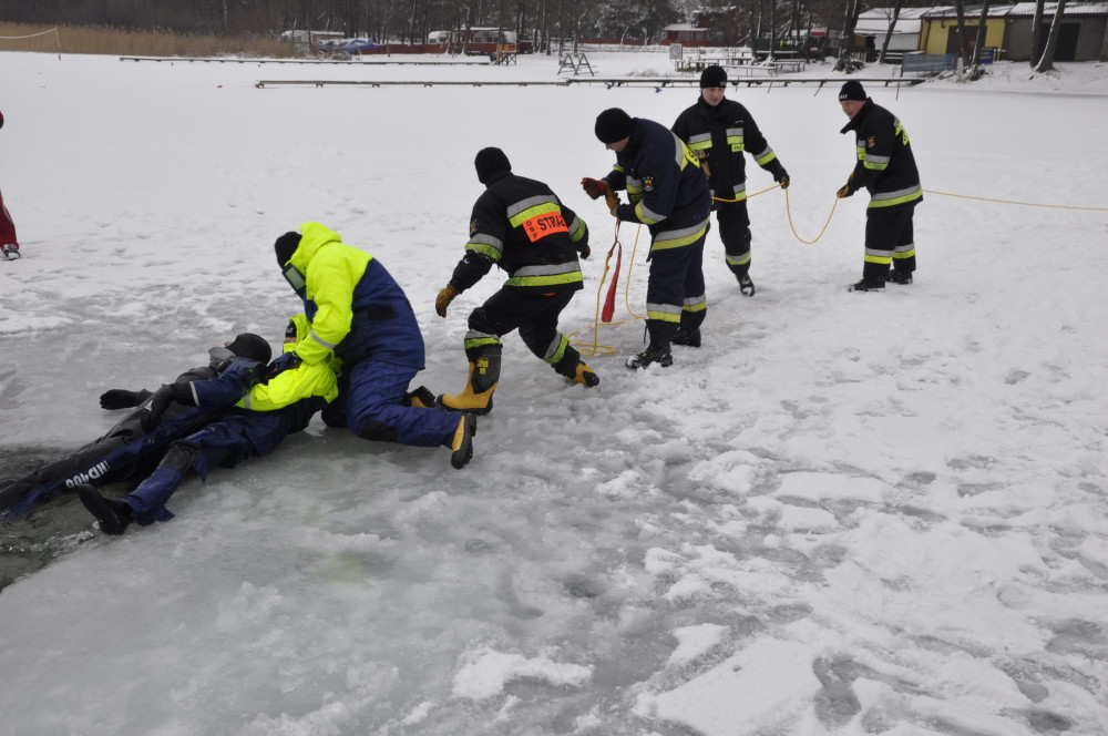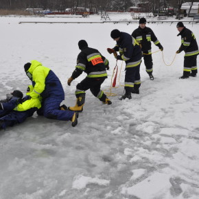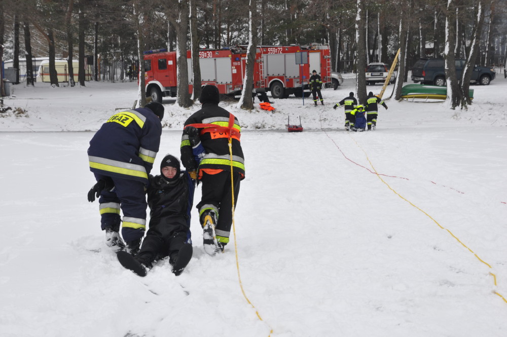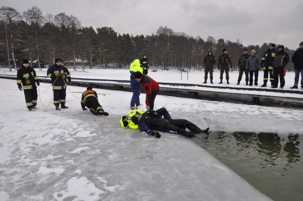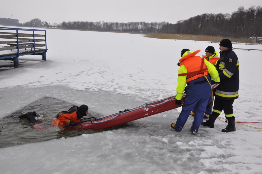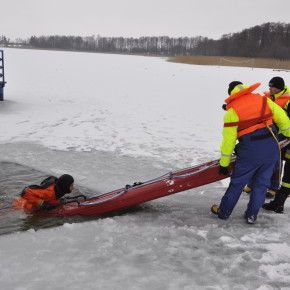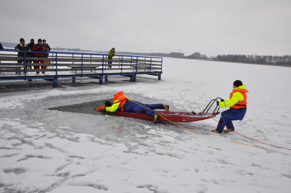 – Musicie pamiętać, że najważniejsze, abyście podejmowali akcję ratunkową w sposób przemyślany i przede wszystkim dla siebie bezpieczny ? mówił Zbigniew Stasiłojć. ? Od niedawna OSP Jedwabno ma na swoim wyposażeniu specjalistyczne sanie lodowe . Dzisiaj mamy doskonałą okazję poćwiczyć ich użycie w praktyce. Co prawda lód jest teraz gruby, ale na pewno powtórzymy ćwiczenia, kiedy ociepli się, a pokrywa będzie znacznie słabsza. Akcja wtedy jest znacznie utrudniona .