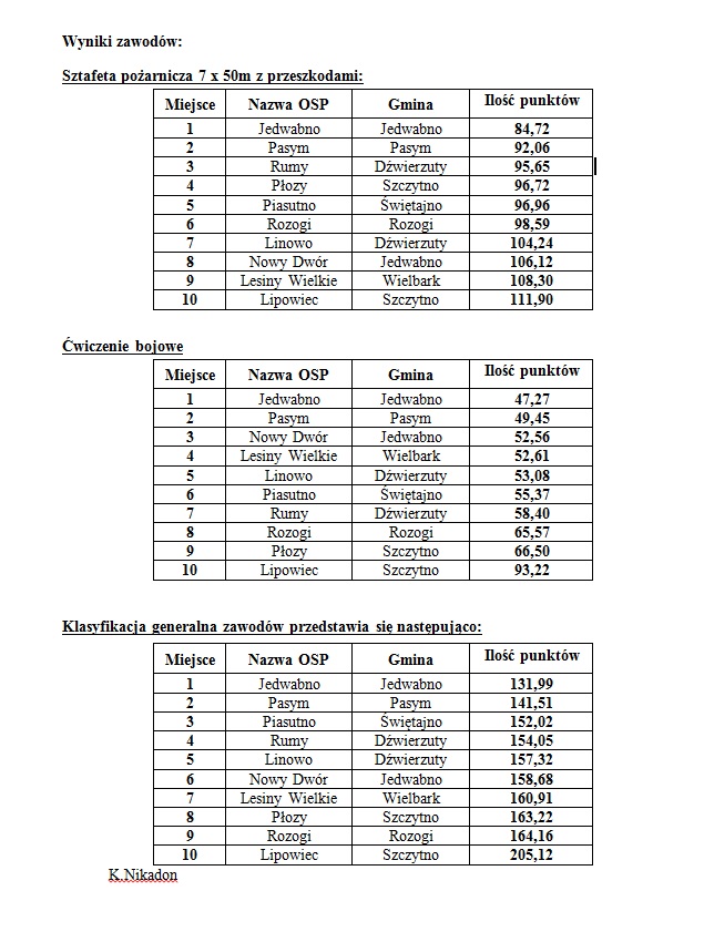 Gminę Jedwabno reprezentowały OSP Nowy Dwór ? dotychczasowy mistrz powiatu w tych zawodach oraz OSP Jedwabno. Po rewelacyjnym starcie OSP Jedwabno zajęło pierwsze miejsce wyprzedzając aż o 10 punktów największą niespodziankę zawodów drużynę OSP Pasym i o 20 punktów OSP Piasutno. OSP Nowy Dwór w łącznej klasyfikacji zawodów zajął 6 miejsce.