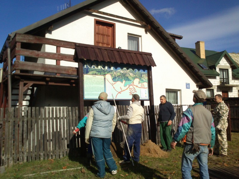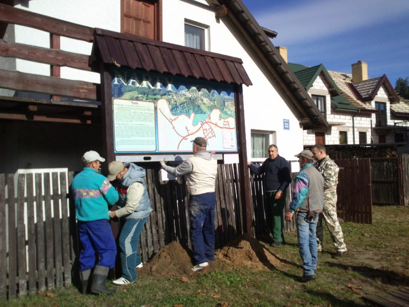 W Nartach przy budynku świetlicy wiejskiej „Promyczek” stanęła tablica informacyjna. Oprócz widoku miejscowości, umieszczono na niej krótki rys historyczny  oraz mapę ulic w Nartach. Mapa ta, znacznie uprości zlokalizowanie szukanej ulicy turystom, jak i samym mieszkańcom. Zaznaczone są na niej przystanki autobusowe, zejścia do jeziora oraz pomniki przyrody. Tablica ma wymiary 250 cm x 125 cm i stanowi nie tylko element informacyjny, ale także ozdobny. Zakupiona została w ramach funduszu sołeckiego na rok 2013.